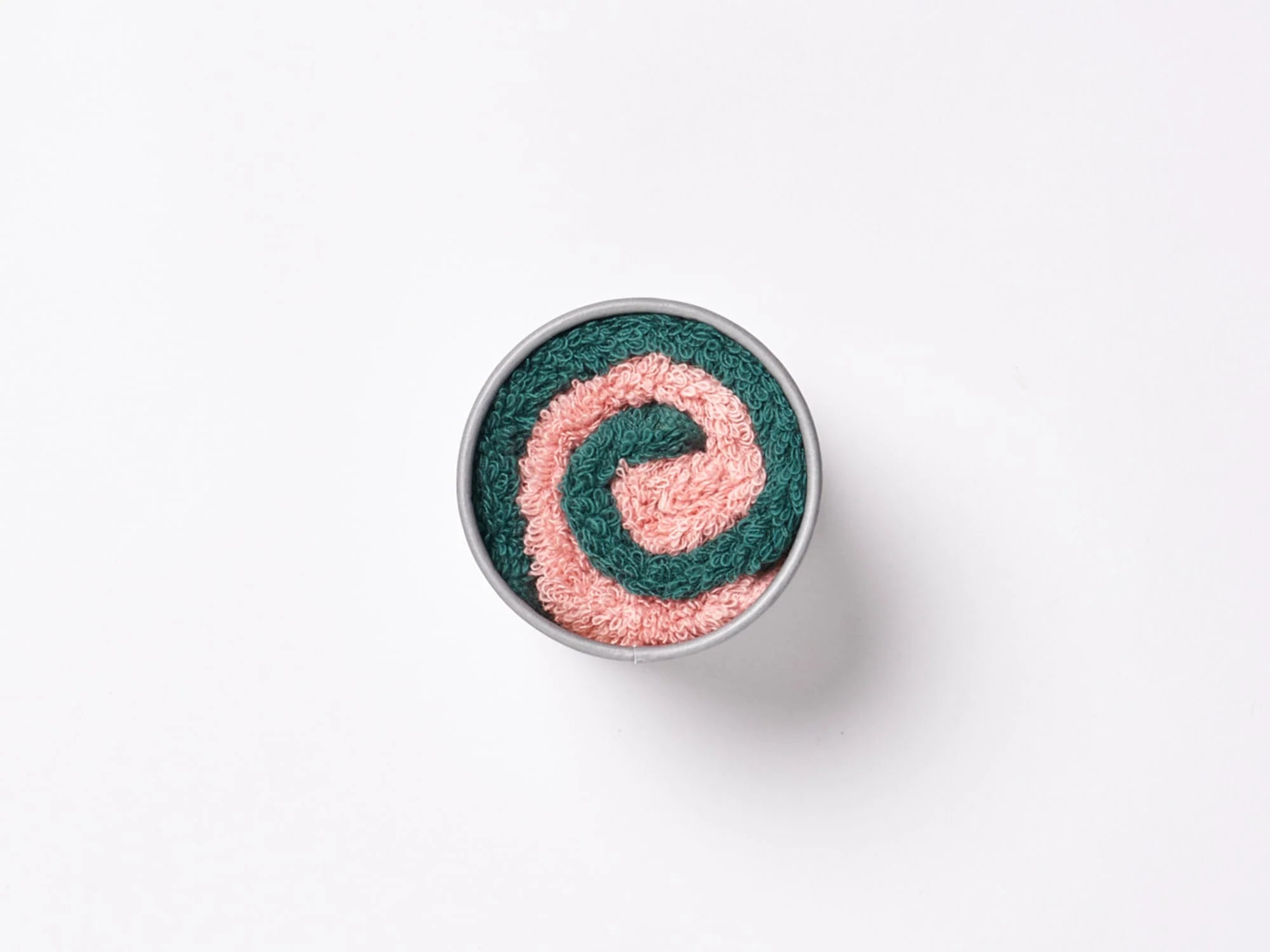 プチハンドタオル2枚を、ロール状に筒形ボックスにお入れします。