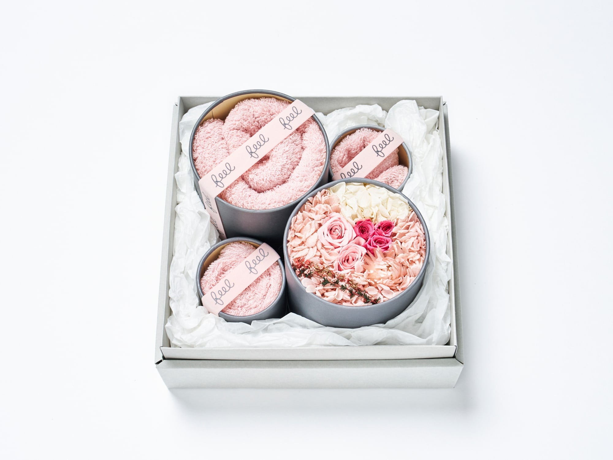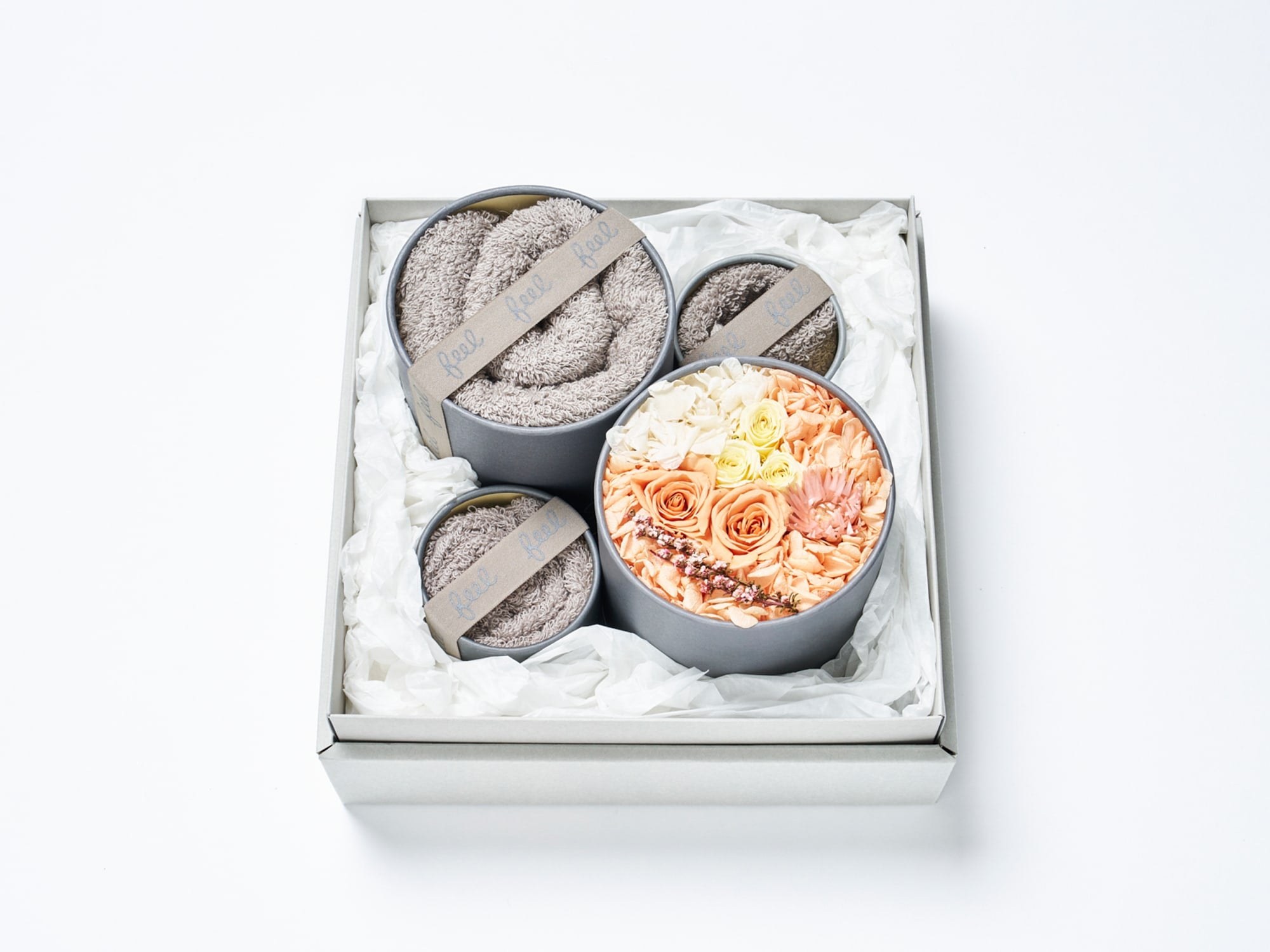 | セット内容 | : | feelフェイスタオル/feelプチフェイスタオル/feelプチハンドタオル 各1枚 +プリザーブドフラワー |