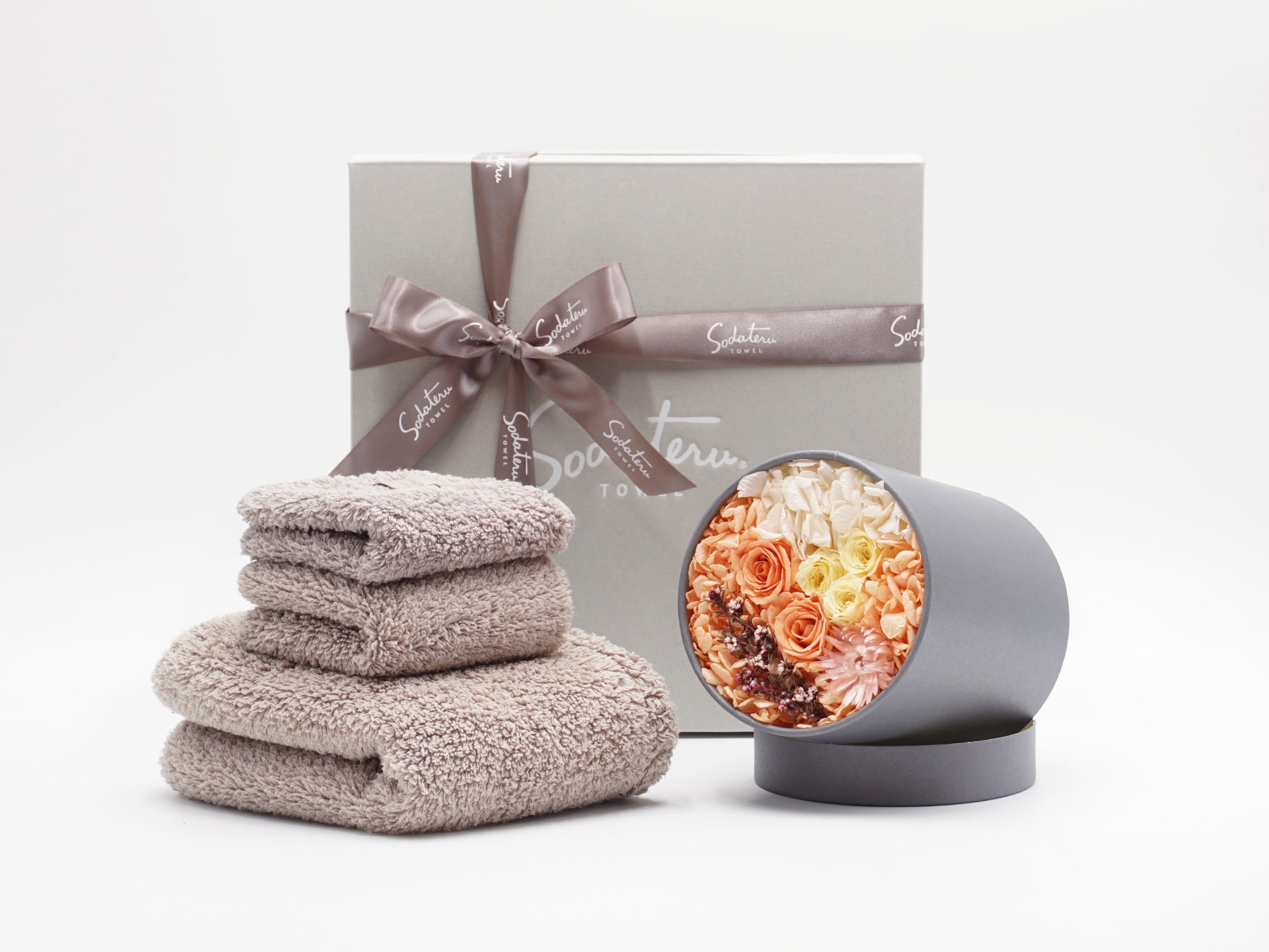 育てるタオルのシグネチャーライン「feel」と、プリザーブドフラワーを組み合わせたギフトセット「DECOR(デコール)」。