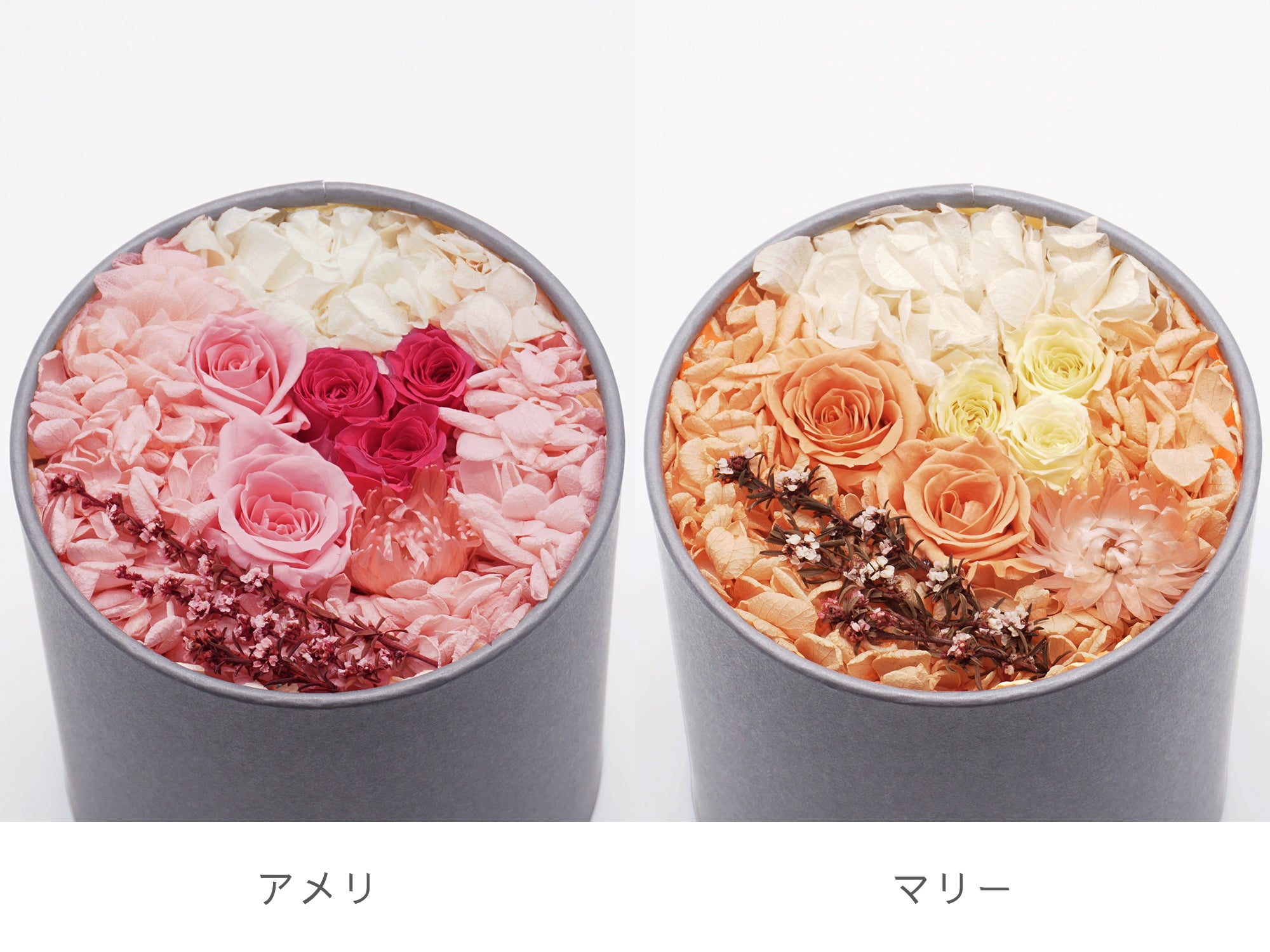 プリザーブドフラワーのデザインは、ピンク系の「アメリ」、オレンジ系の「マリー」の2種類。