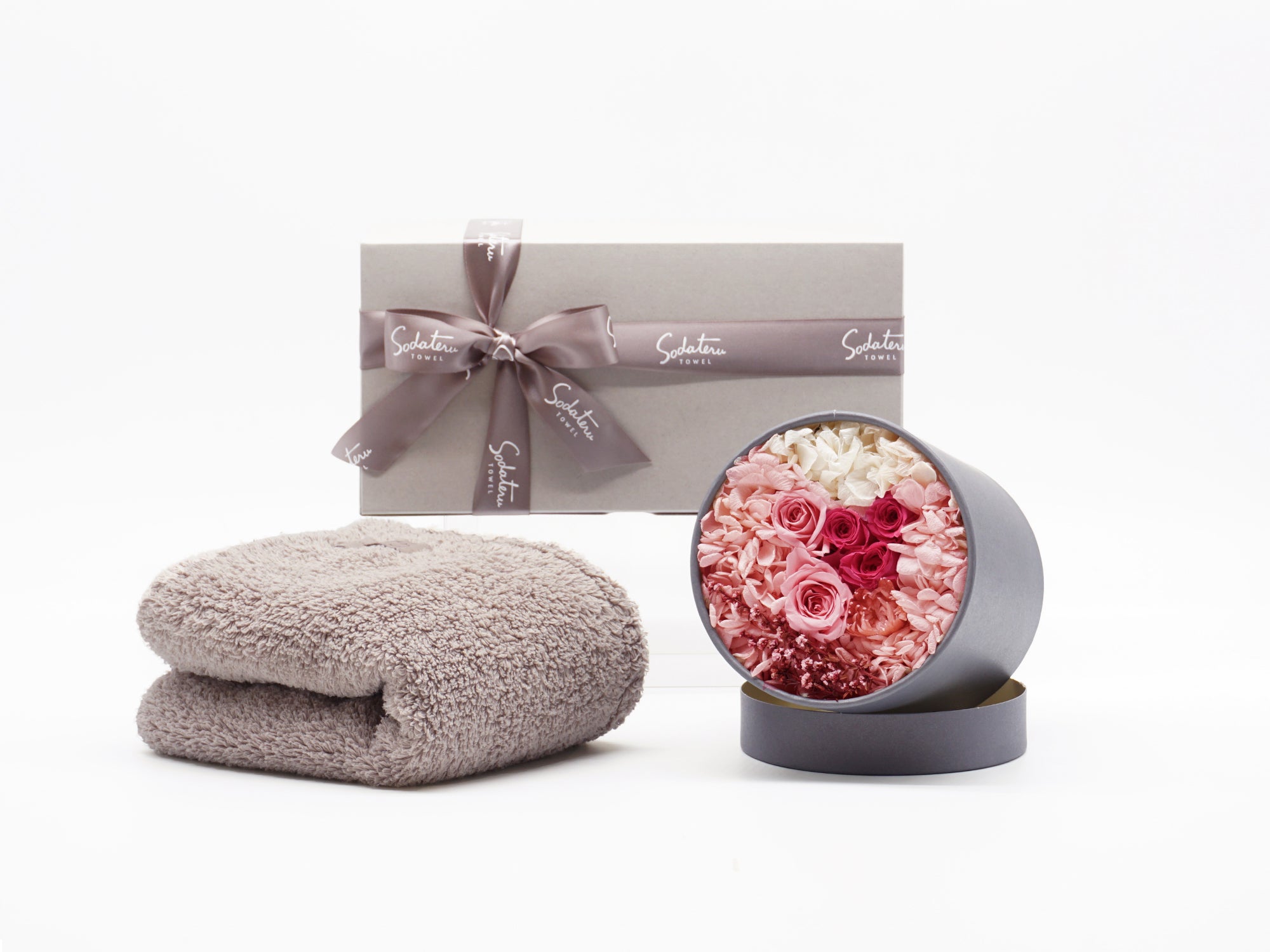 育てるタオルのシグネチャーライン「feel」と、プリザーブドフラワーを組み合わせたギフトセット「DECOR(デコール)」。